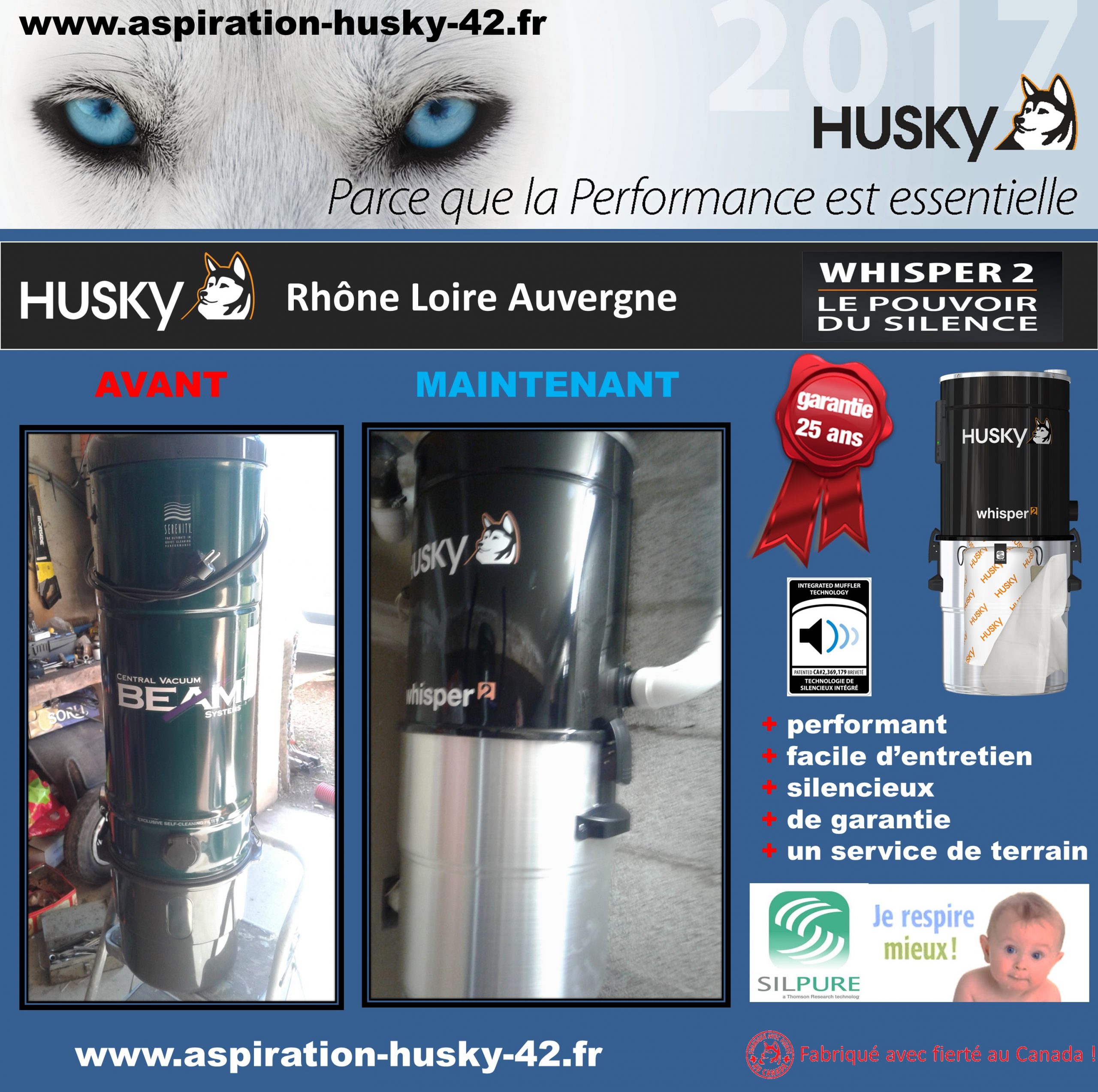 C’est un modèle HUSKY Whisper² d’une technologie brevetée avec un moteur by-pass d’une puissance d’aspiration de 3977 mm de dépression pour seulement 62 décibels, d’une filtration qualitative avec entretien simplifié et traitement SILPURE.