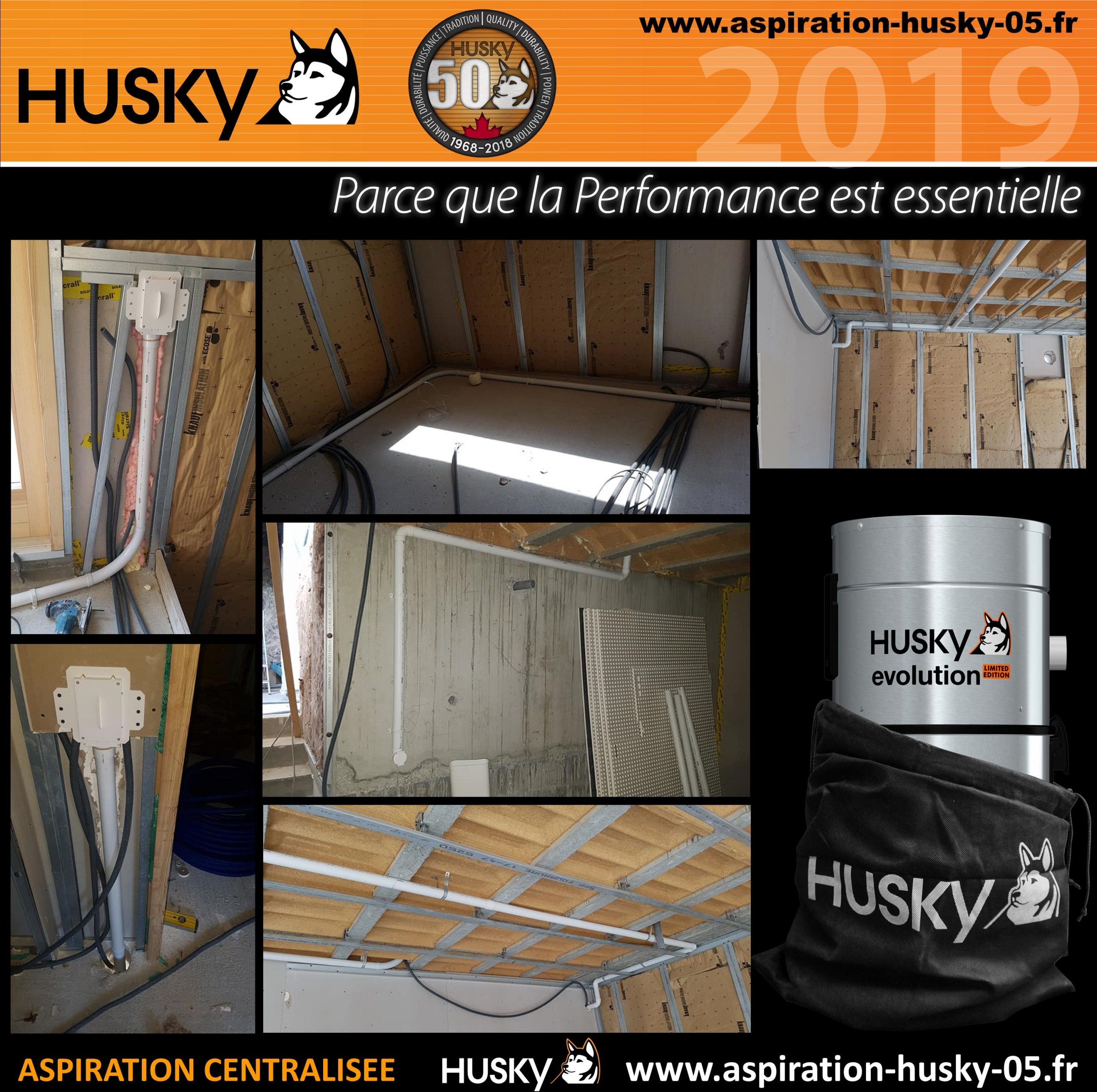 Installation d’un réseau PVC qui alimente 2 prises d’aspiration en flexible rétractable, le système Jet’Flex de Hide-A-Hose « l’original », avec 1 prise de service au garage et de l’option prise cuisine ramasse miettes. L’ensemble sera raccordé sur un modèle Husky ÉVOLUTION, modèle spécifique pour le 50ème anniversaire de la marque Husky. Modèle hybride, filtre traité SILPURE et lavable en machine à laver, diode de contrôle, moteur by-pass d’une puissance d’aspiration de 3977 mm de dépression avec démarrage et arrêt temporisé, couvert d’une garantie de 25 ans par le manufacturier des produits Husky.