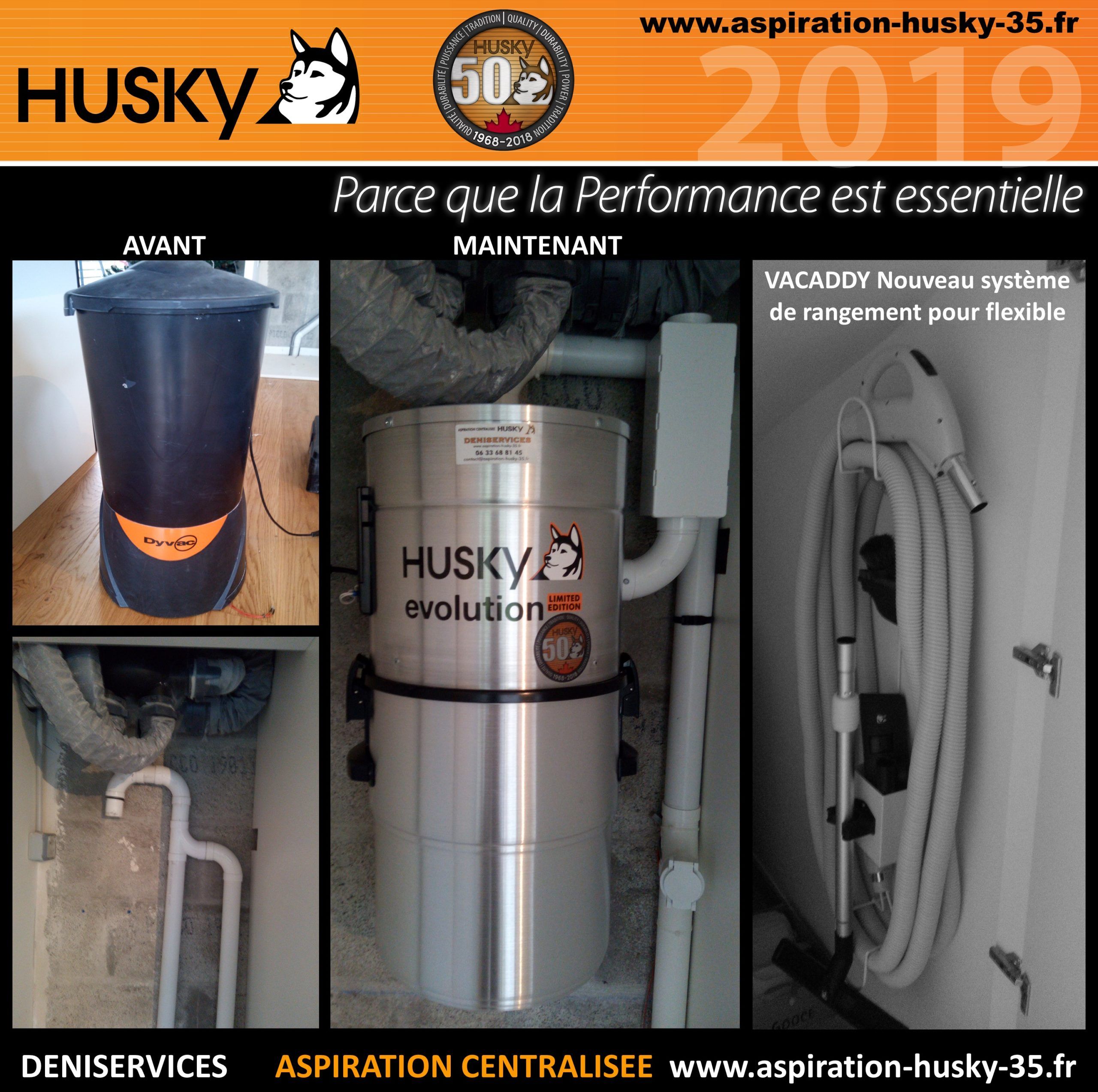 La société DENISERVICES est intervenue dans une maison équipée d’un système d’aspiration centralisé, située à Locmiquélic 56570 dans le sud du département du Morbihan et de la région Bretagne. Cette maison d’habitation était équipée d’un système d’aspiration centralisée avec la marque DYVAC sur un réseau PVC qui alimente 3 prises d’aspiration. Les clients ont souhaité le remplacement de leur ancienne centrale d’aspiration par un modèle Husky. C’est donc un modèle ÉVOLUTION, édition limité spécifique pour le 50ème anniversaire de la marque ! Équipé d’un moteur by-pass d’une puissance d’aspiration de 3977 mm de dépression avec démarrage et arrêt du moteur temporisé, diode de contrôle, filtre de la centrale d’aspiration est traité SILPURE et lavable en machine à laver, capacité de cuve de 34 litres, modèle hybride, tout en aluminium brossé et couvert d’une garantie de 25 ans par le manufacturier des produits Husky. C’est aussi l’installation d’un système Vacaddy qui stocke votre flexible d’aspirateur central et vos accessoires de manière fonctionnelle, peu encombrante et esthétique.