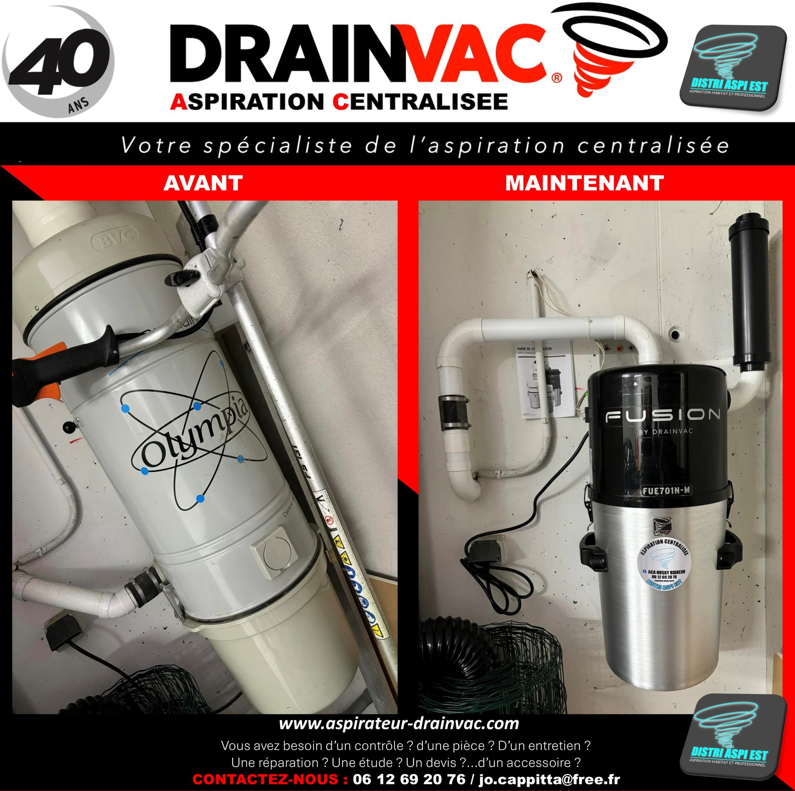 Intervention de la société DISTRI EST ASPI ACA dans une maison existante située à  Bartenheim 68870 dans le département du Haut-Rhin en Alsace, région Grand Est. Cette maison était équipé d’un système d’aspiration centralisée avec la marque OLYMPIA sur un réseau PVC qui alimente plusieurs prises d’aspiration classiques. Les clients ont opté pour le remplacement de leur centrale d’aspiration par un modèle DRAINVAC FUSION. La centrale d’aspiration DRAINVAC FUSION : modèle hybride, avec ou sans sac au choix des utilisateurs, performant avec une puissance d’aspiration de 3880 mm de dépression et 315 m3/h, équipé d’un filtre lavable, niveau sonore 58 dB, capacité de cuve de 41 litres.