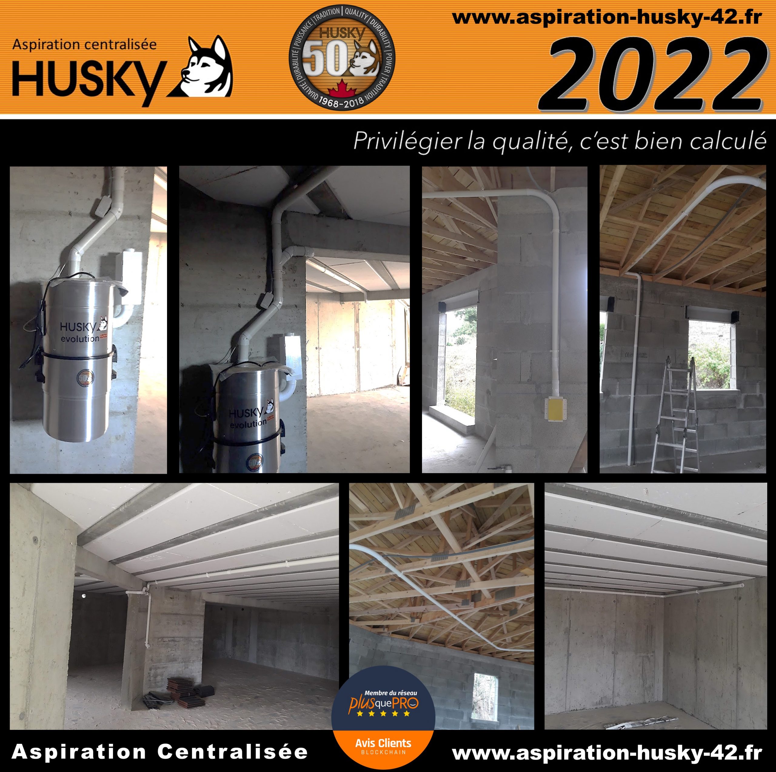 L’ensemble de ce réseau a été raccordé sur un modèle Husky ÉVOLUTION, système hybride, équipé d’un moteur by-pass avec démarrage et arrêt temporisé et d’une puissance d’aspiration de 3977 mm de dépression. Filtre lavable en machine à laver et traité SILPURE, capacité de cuve de 34 litres, diodes de contrôle, tout en aluminium brossé et couvert d’une garantie de 25 ans par le manufacturier Canadien des produits Husky.