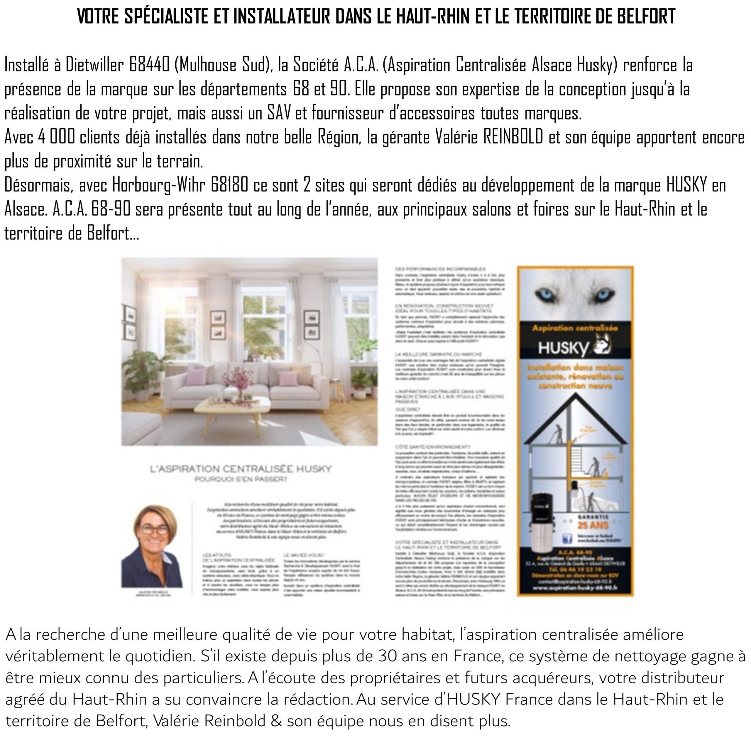 Installé à Dietwiller 68440 (Mulhouse Sud), la Société A.C.A. (Aspiration Centralisée Alsace Husky) renforce la présence de la marque sur les départements 68 et 90. Elle propose son expertise de la conception jusqu’à la réalisation de votre projet, mais aussi un SAV et fournisseur d’accessoires toutes marques. Avec 4 000 clients déjà installés dans notre belle Région, la gérante Valérie REINBOLD et son équipe apportent encore plus de proximité sur le terrain. Désormais, avec Horbourg-Wihr 68180 ce sont 2 sites qui seront dédiés au développement de la marque HUSKY en Alsace. A.C.A. 68-90 sera présente tout au long de l’année, aux principaux salons et foires sur le Haut-Rhin et le territoire de Belfort…