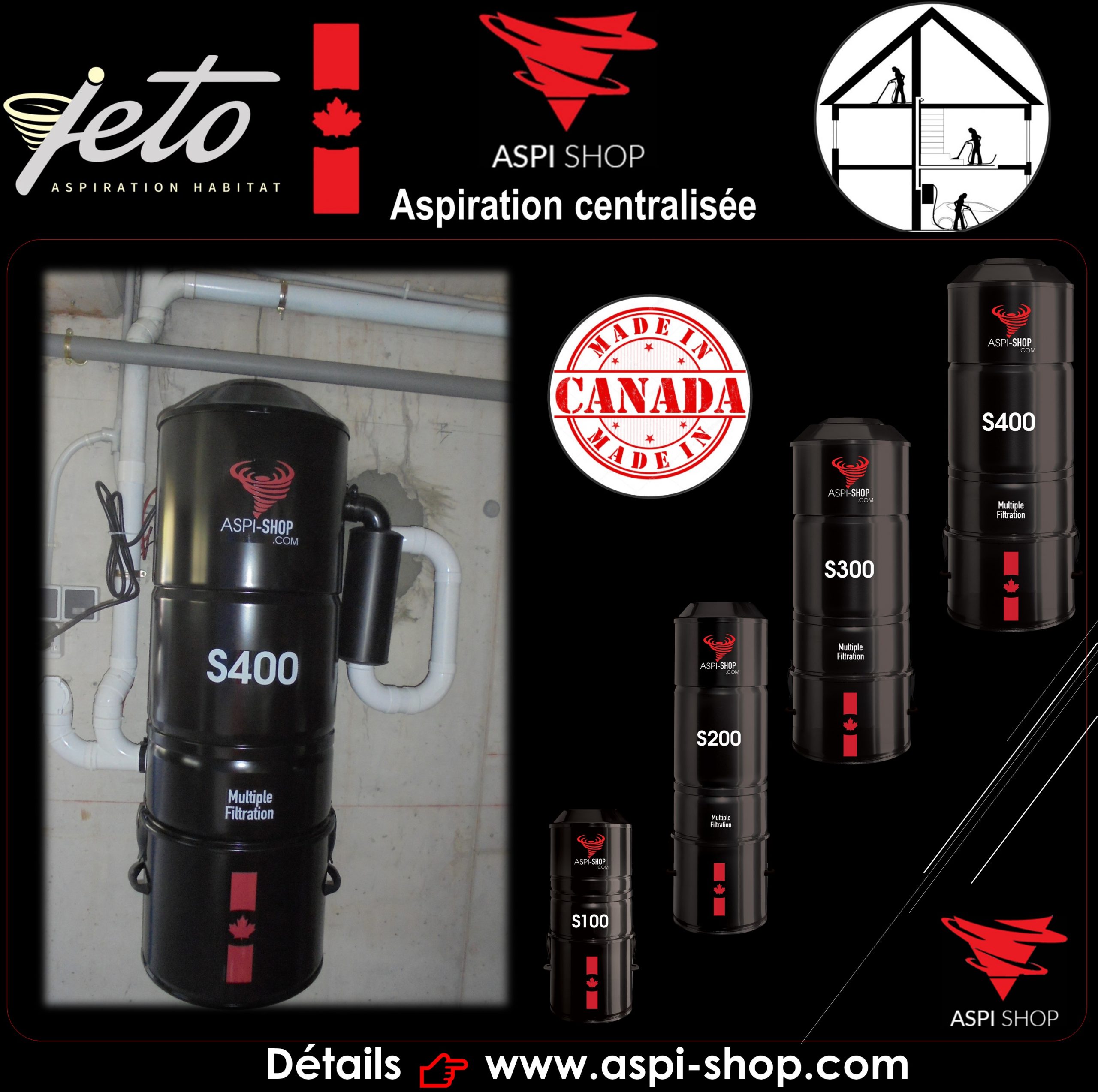 Le modèle ASPI SHOP S400, système hybride, 2 moteurs d’une puissance d’aspiration de 4318 mm de dépression (43 KPA), 695 Air watts, capacité de cuve de 23 litres, 2 entrées d’air, filtre HEPA avec décolmatage automatique, modèle garantie 10 ans.
