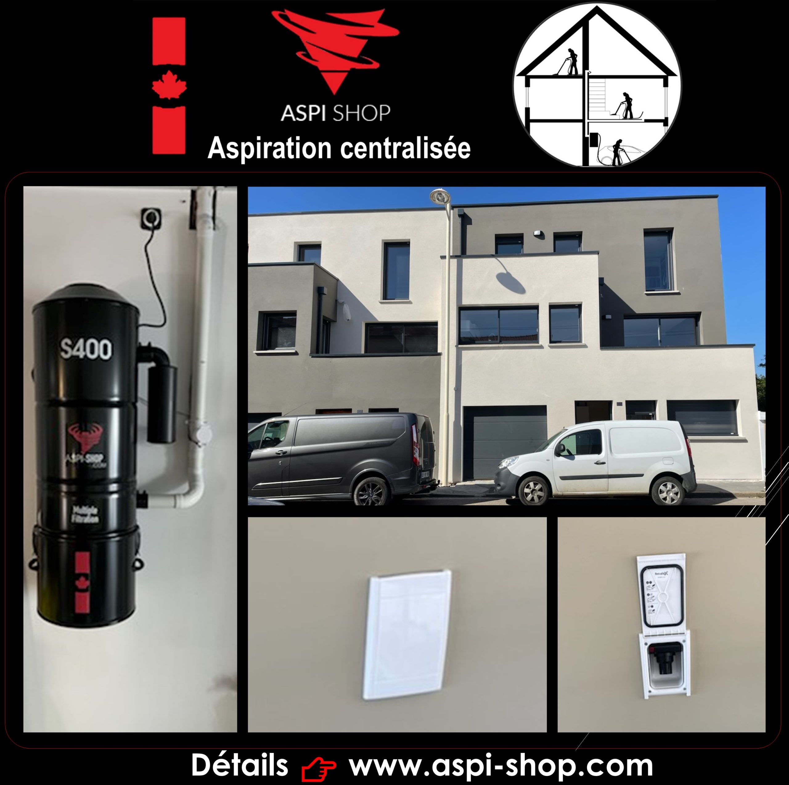 Installation d’un réseau PVC qui alimente 3 prises d’aspiration en version flexible rétractable permettant de couvrir l’ensemble de l’habitation et le garage. L’ensemble de ce réseau a été raccordé sur un modèle ASPI SHOP S400, système hybride, 2 moteurs d’une puissance d’aspiration de 4318 mm de dépression (43 KPA), 695 Air watts, capacité de cuve de 23 litres, 2 entrées d’air, filtre HEPA avec décolmatage automatique, modèle garantie 10 ans.