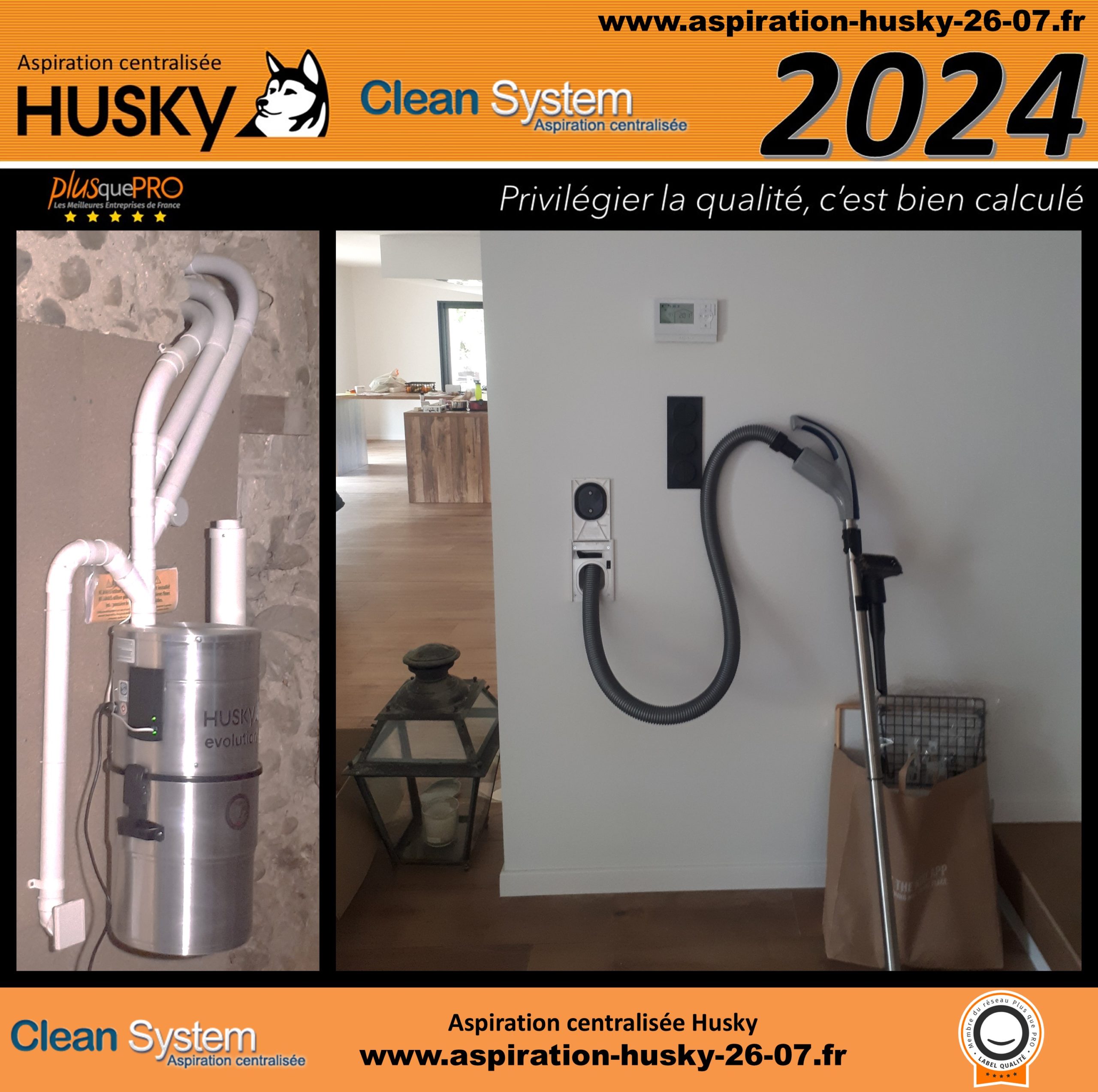 Installation d’un réseau de conduits en PVC desservant une prise pour flexible rétractable de 15 mètres ainsi qu’une prise classique. Ce réseau est raccordé à un modèle HUSKY ÉVOLUTION, un système hybride performant équipé d’un moteur by-pass. Celui-ci bénéficie d’un démarrage et arrêt progressif, d’une puissance d’aspiration de 3977 mm de dépression, d’une diode de contrôle, ainsi que d’une cuve de 34 litres avec filtre lavable et traité SILPURE.