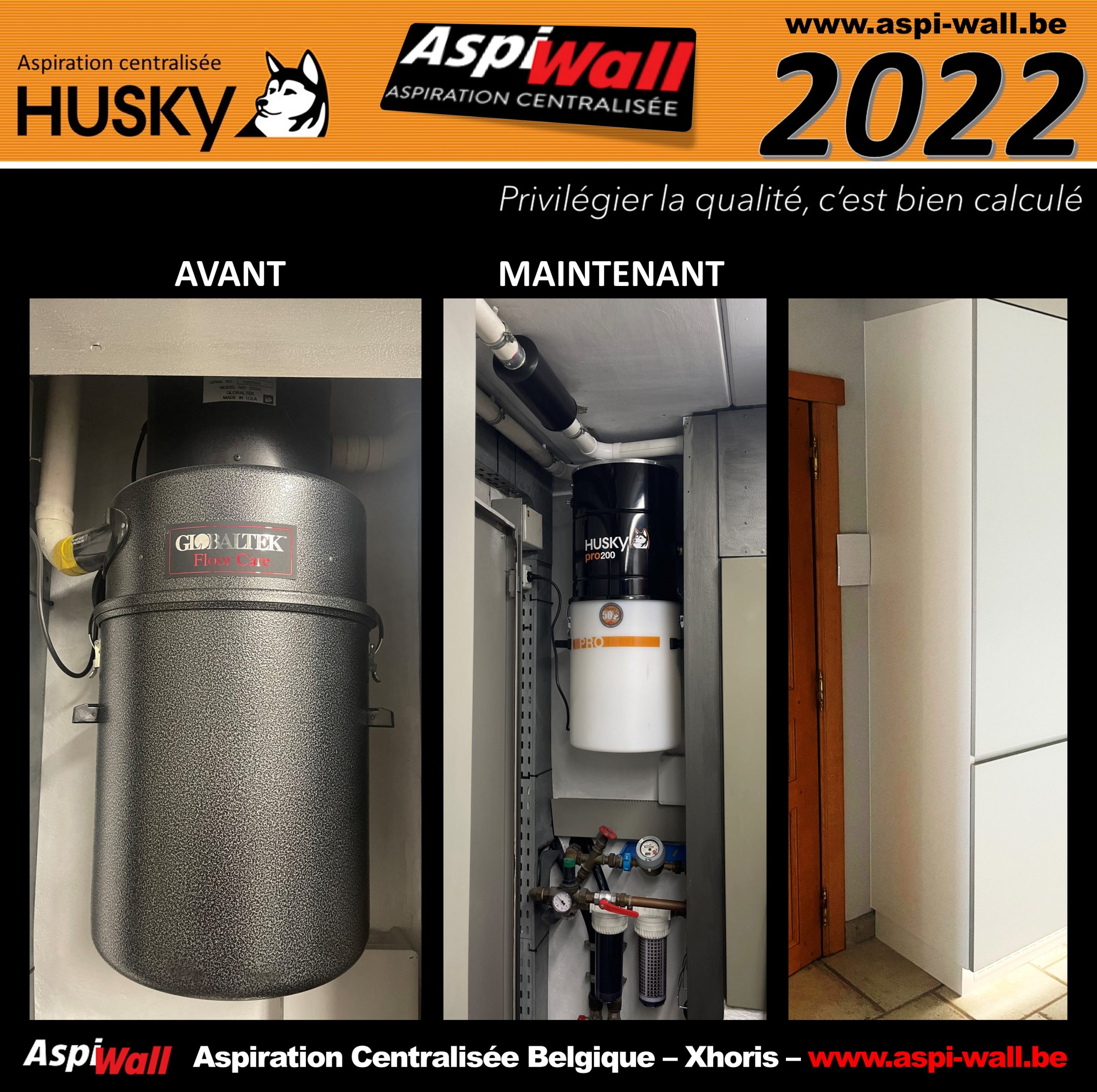 C’est après l’installation par les clients d’un système de flexible rétractable RétraFlex par le biais de l’équipe ASPI WALL aspiration centralisée, sur un réseau PVC existant avec des prises classiques raccordé sur une centrale de la marque GLOBALTEK que les clients ont également opté pour le remplacement de leur centrale d’aspiration avec un modèle HUSKY PRO 200. Maison existante située à Waha, une section de la ville de Marche-en-Famenne 6900, région wallonne en Belgique.