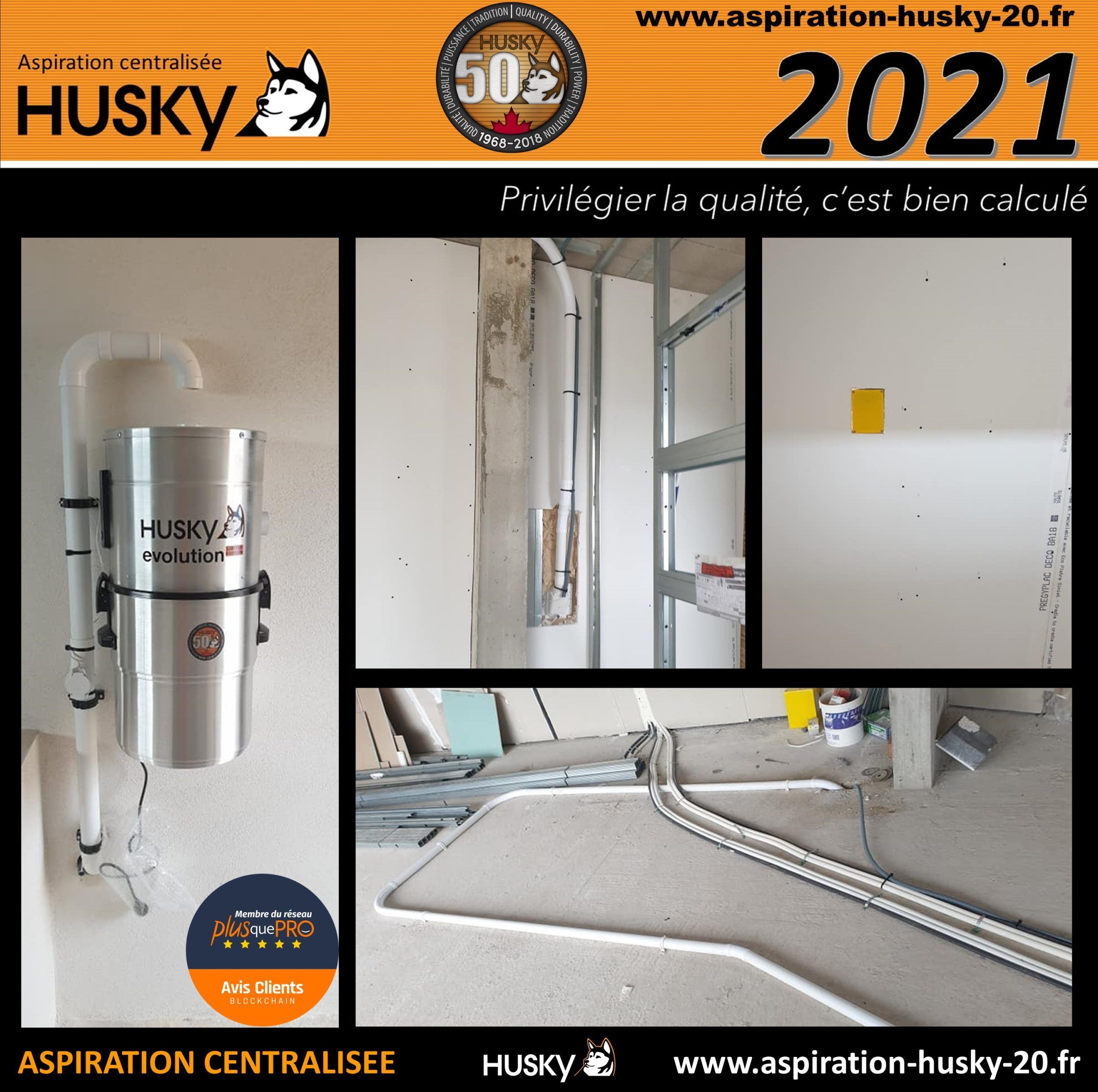 L’ensemble de ce réseau a été raccordé sur un modèle Husky ÉVOLUTION, « édition limitée de la marque Husky », hybride, filtre lavable en machine à laver et traité SILPURE, diode de contrôle, moteur by-pass d’une puissance d’aspiration de 3977 mm de dépression avec démarrage et arrêt automatique, cuve de 34 litres, modèle couvert d’une garantie de 25 ans par le manufacturier Canadien des produits Husky.
