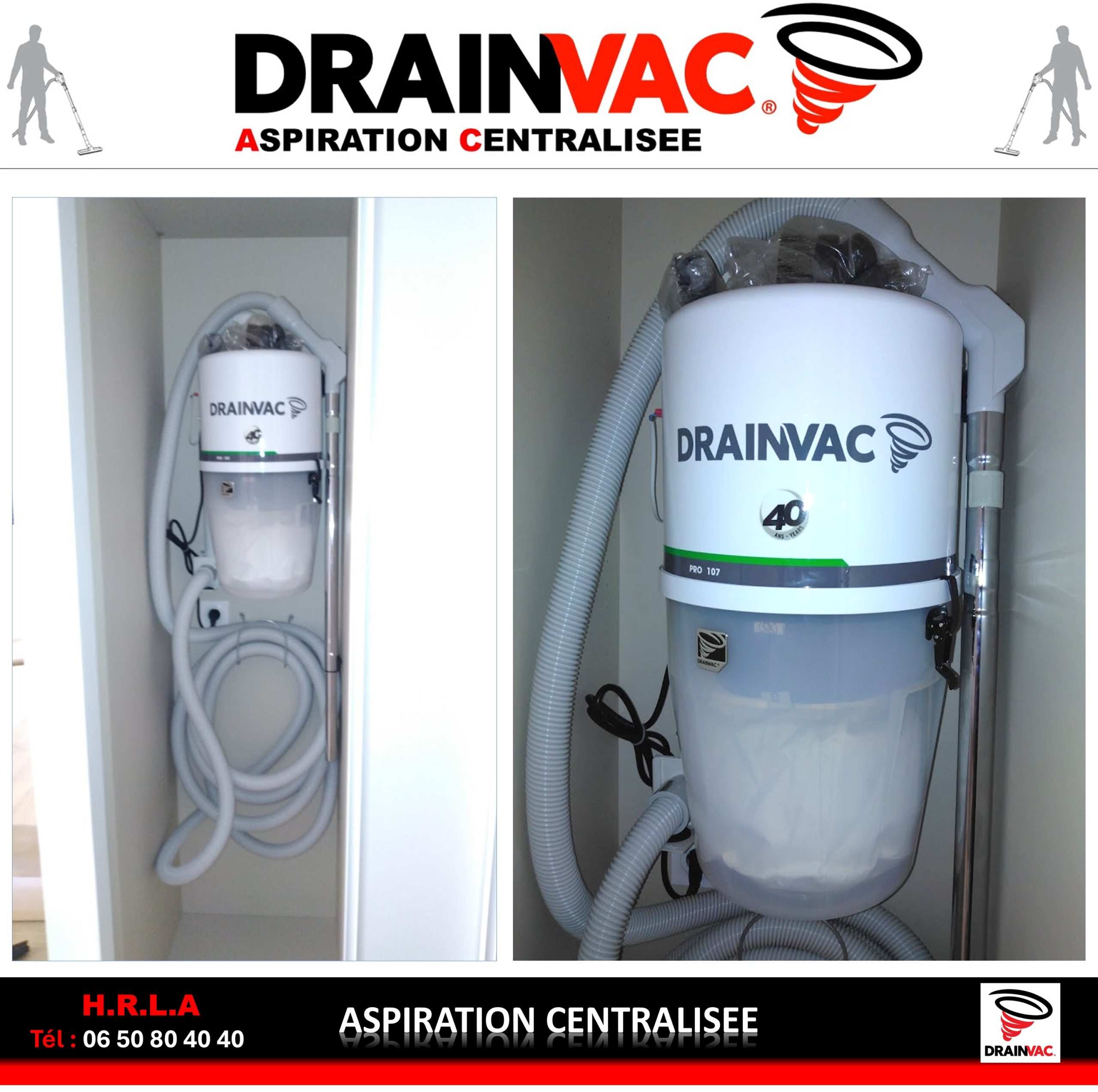 Installation d’une centrale d’aspiration DRAINVAC modèle PROE 107 dans un placard de l’appartement ainsi qu’un réseau PVC qui alimente 1 prise d’aspiration positionnée à côté de la centrale d’aspiration et, qui permet à l’aide d’un flexible de 9 mètres de couvrir l’ensemble du logement.