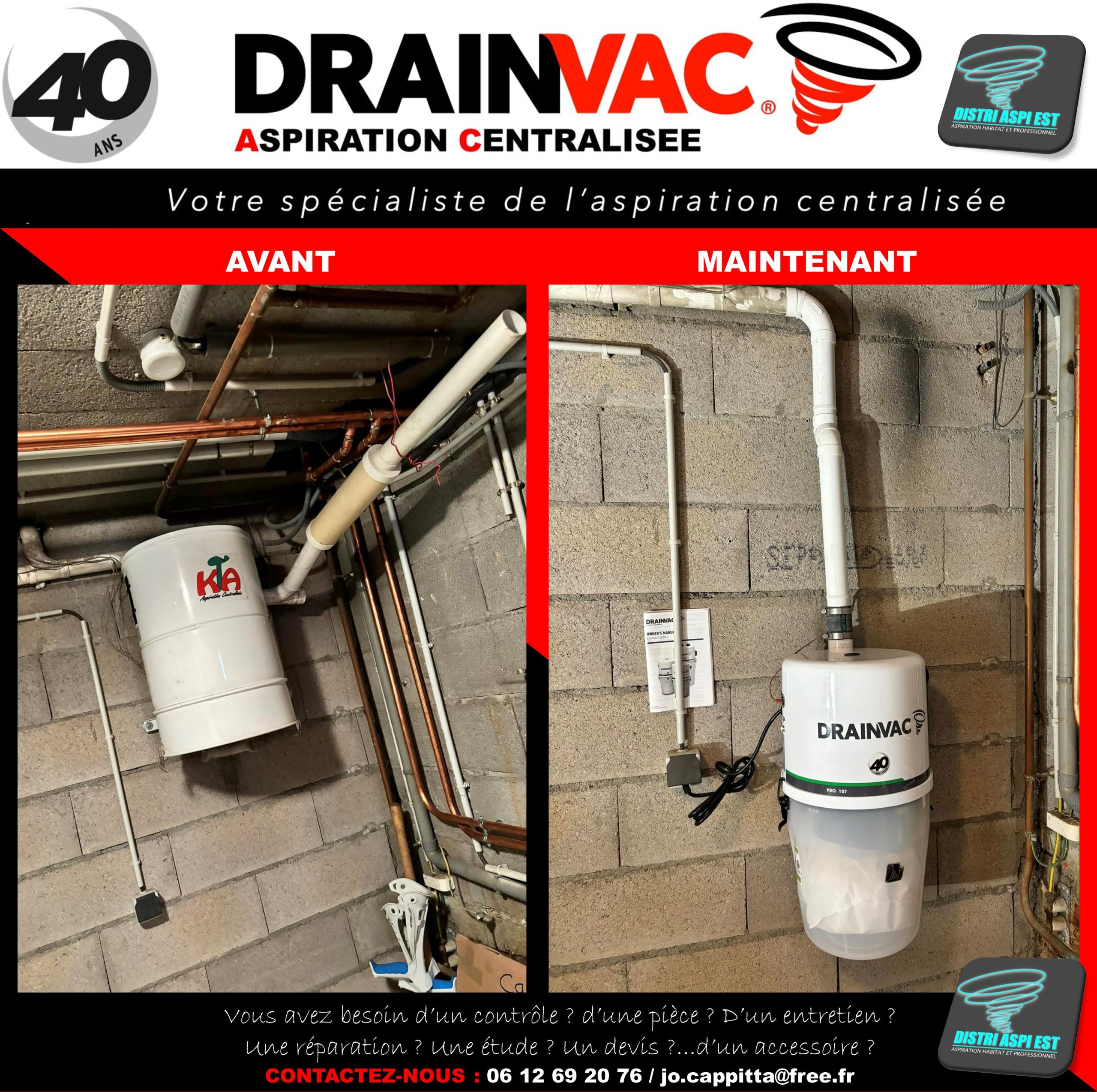 Intervention de la société DISTRI EST ASPI ACA dans une maison existante située à Riquewihr 68340 dans le département du Haut-Rhin en Alsace, région Grand Est. Cette maison était équipée d’un système d’aspiration centralisée avec la marque KTA, sur un réseau PVC qui alimente plusieurs prises d’aspiration classiques. Les clients ont opté pour le remplacement de leur centrale avec un modèle DRAINVAC PROE 107.