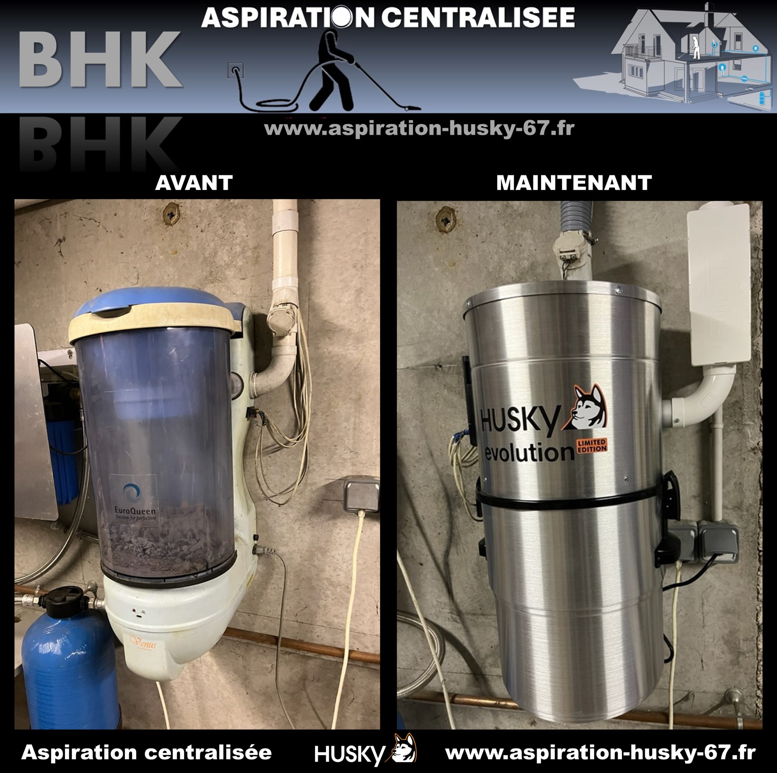 Intervention de la société BHK dans une maison existante située à Eberbach-Seltz 67470 dans le département du Bas-Rhin en Alsace, région Grand Est. Cette maison était équipée d’un système d’aspiration centralisée avec la marque ATOME sur un réseau PVC qui alimente plusieurs prises d’aspiration classiques. Les clients ont opté pour le remplacement de leur centrale d’aspiration par un modèle Husky ÉVOLUTION « édition limitée » de la marque Husky. Modèle hybride, équipé d’un filtre traité SILPURE et lavable en machine à laver, diode de contrôle, cuve de 34 litres, moteur By-pass avec démarrage et arrêt temporisé, puissance d’aspiration de 3977 mm de dépression.