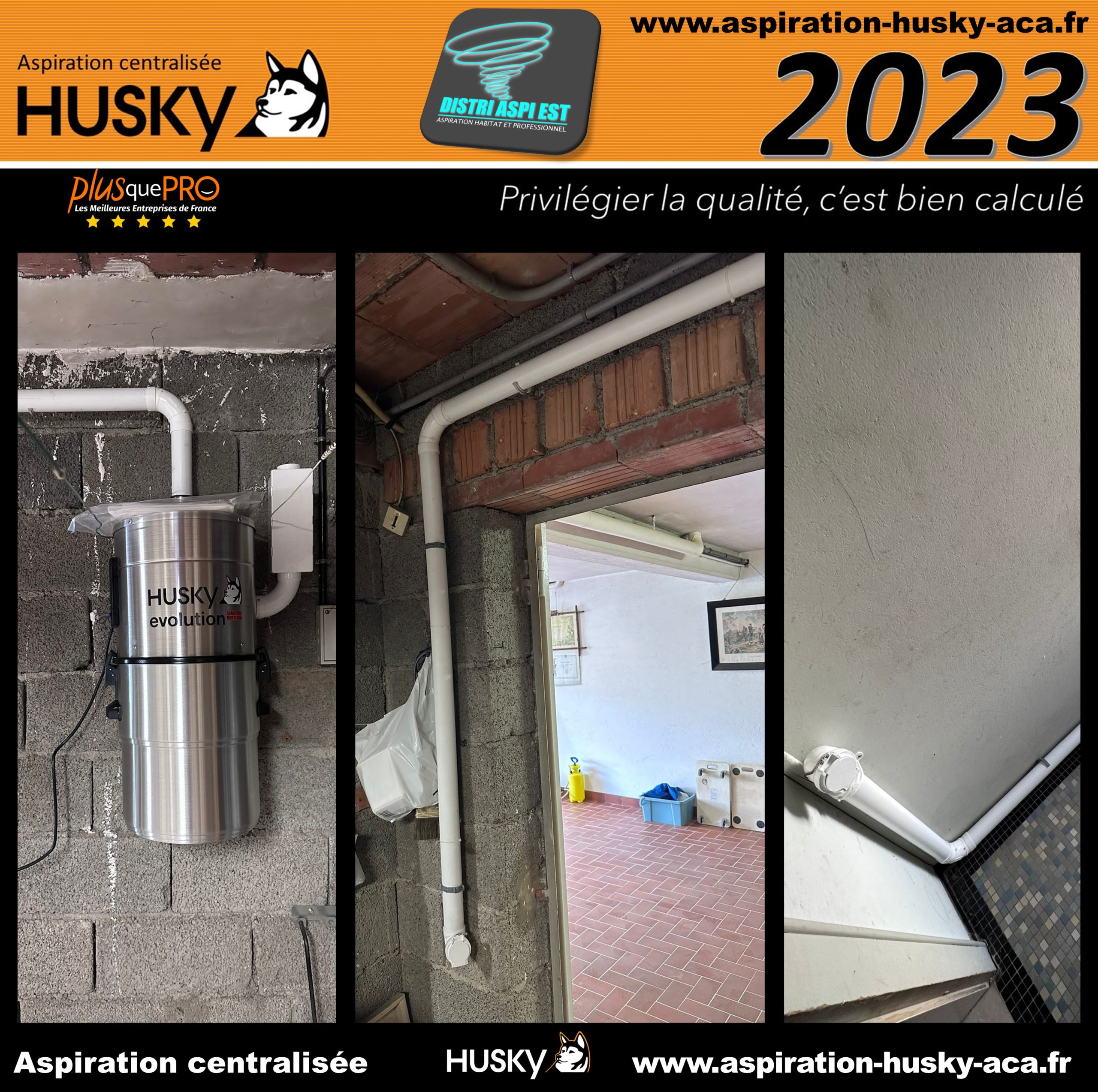Installation d’un réseau PVC qui alimente 2 prises d’aspiration classiques, l’ensemble de ce réseau a été raccordé sur un modèle Husky ÉVOLUTION, système hybride équipé d’un filtre lavable en machine à laver et traité SILPURE, diode de contrôle pour un minimum d’informations aux utilisateurs, cuve de 34 litres, moteur avec démarrage et arrêt temporisé, d’une puissance d’aspiration de 3972 mm de dépression (39 KPA) modèle couvert d’une garantie de 25 ans par le manufacturier Canadien des produits Husky.
