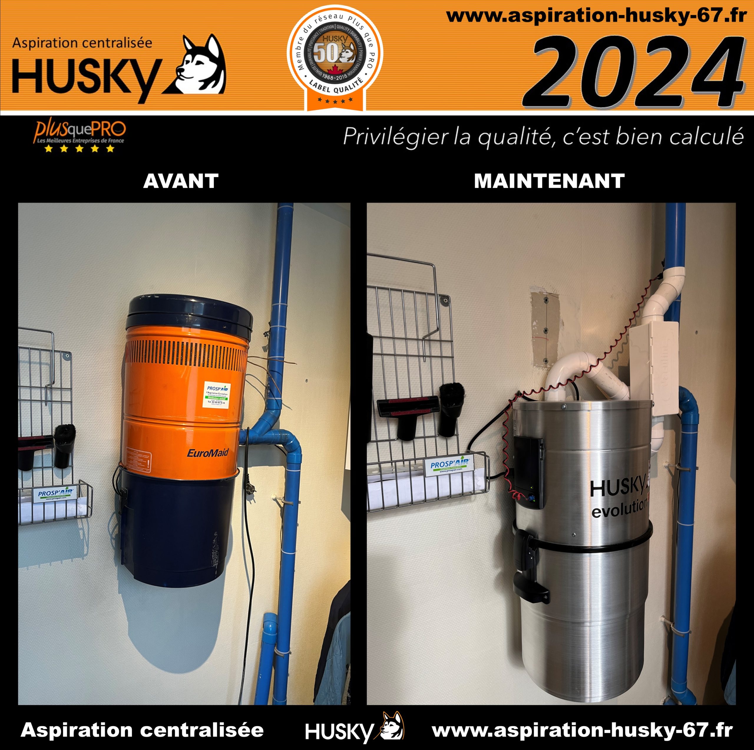 Intervention de la société BHK dans une maison existante située à Wasselonne 67310 dans le département du Bas-Rhin en Alsace, région Grand Est. Cette maison était équipée d’un système d’aspiration centralisée avec la marque EUROMAID sur un réseau PVC qui alimente plusieurs prises d’aspiration classiques. Les clients ont opté pour le remplacement de leur centrale d’aspiration par un modèle Husky ÉVOLUTION « édition limitée » de la marque Husky. Modèle hybride, équipé d’un filtre traité SILPURE et lavable en machine à laver, diode de contrôle, cuve de 34 litres, moteur By-pass avec démarrage et arrêt temporisé, puissance d’aspiration de 3977 mm de dépression.