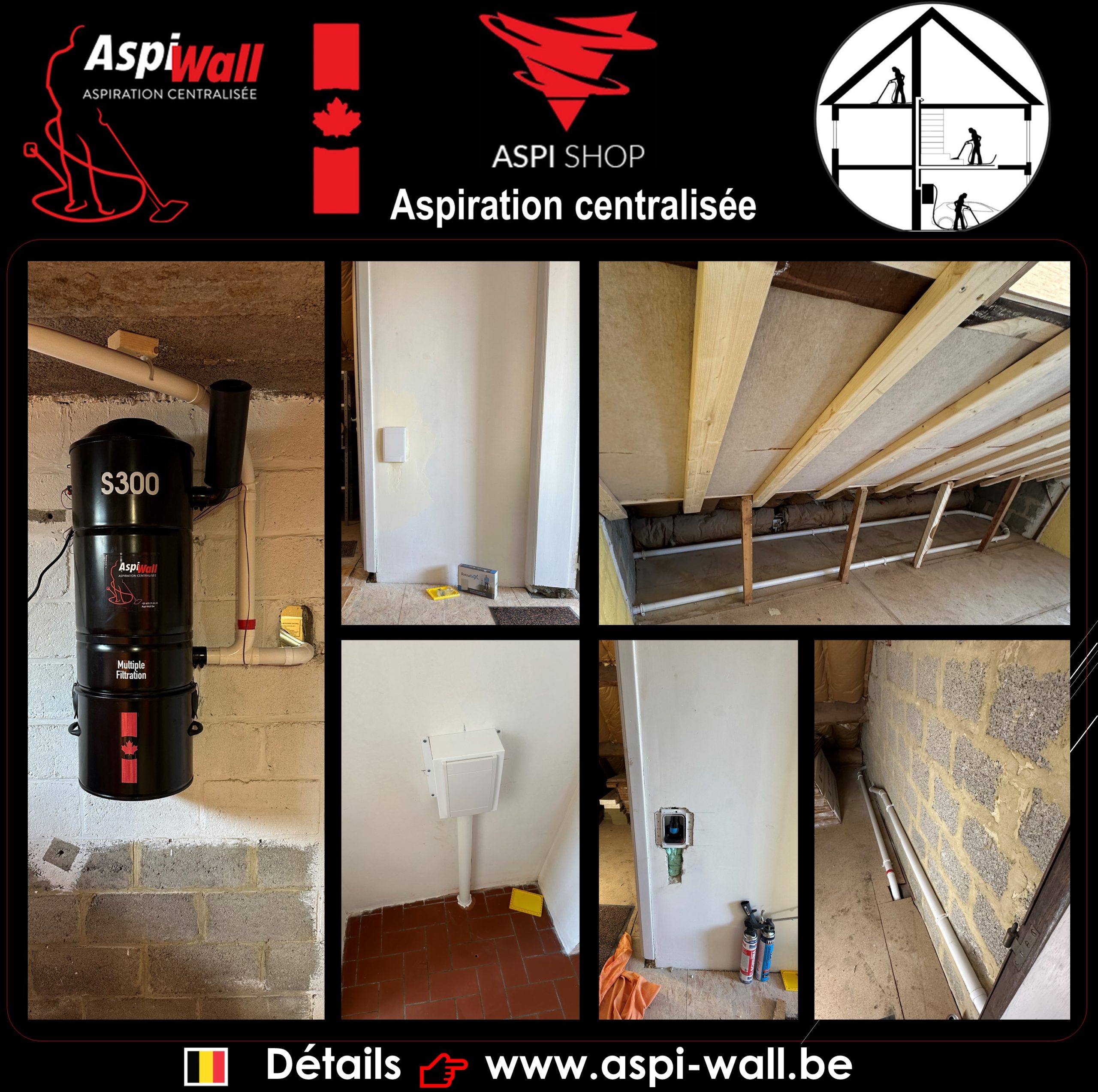 Une réalisation de la société Aspi-Wall dans une maison existante partiellement en rénovation et située à Warsage 4608 dans la région wallonne en Belgique. Installation d’un réseau PVC qui alimente 2 prises d’aspiration pour système de flexible rétractable avec des flexibles de 12 et de 15 mètres. L’ensemble de ce réseau a été raccordé sur une centrale d’aspiration ASPI-SHOP S300.