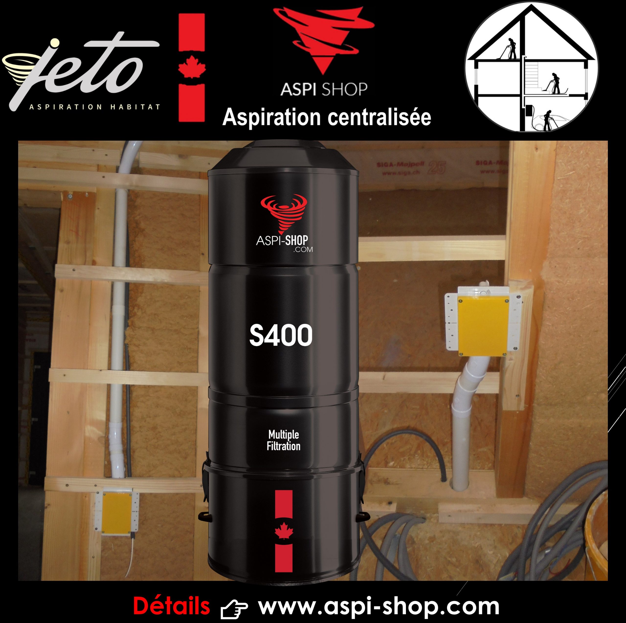 L’ensemble de ce réseau sera raccordé sur un modèle ASPI SHOP S400, modèle bimoteur, hybride avec filtre HEPA autonettoyant, puissance d’aspiration de 4318 mm de dépression !