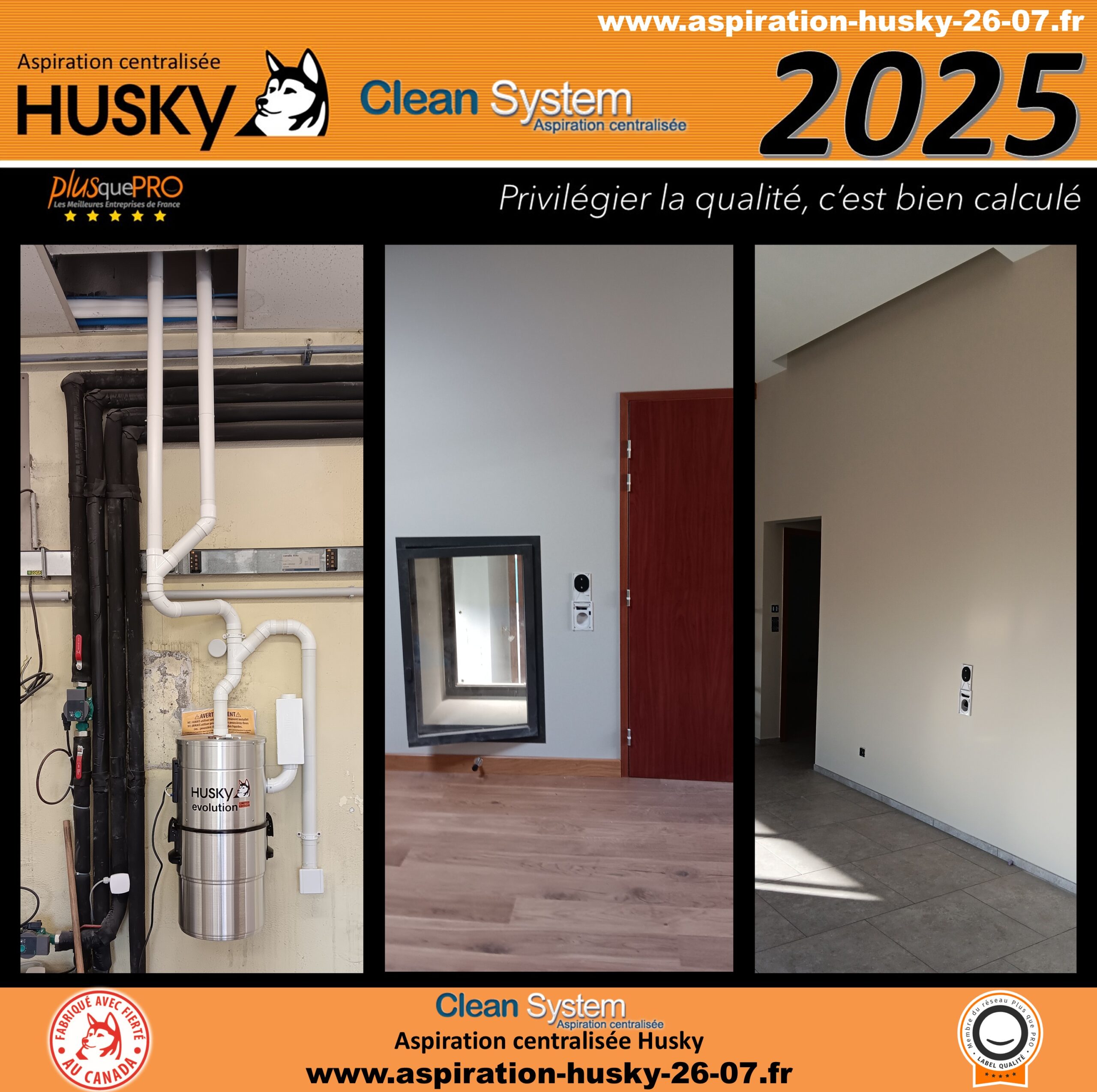 L’installation comprend un réseau PVC desservant deux prises pour flexibles rétractables, permettant de couvrir l’ensemble de cette habitation. Ce réseau est relié à la centrale HUSKY ÉVOLUTION, un modèle hybride hautement performant, équipé d’un moteur by-pass.