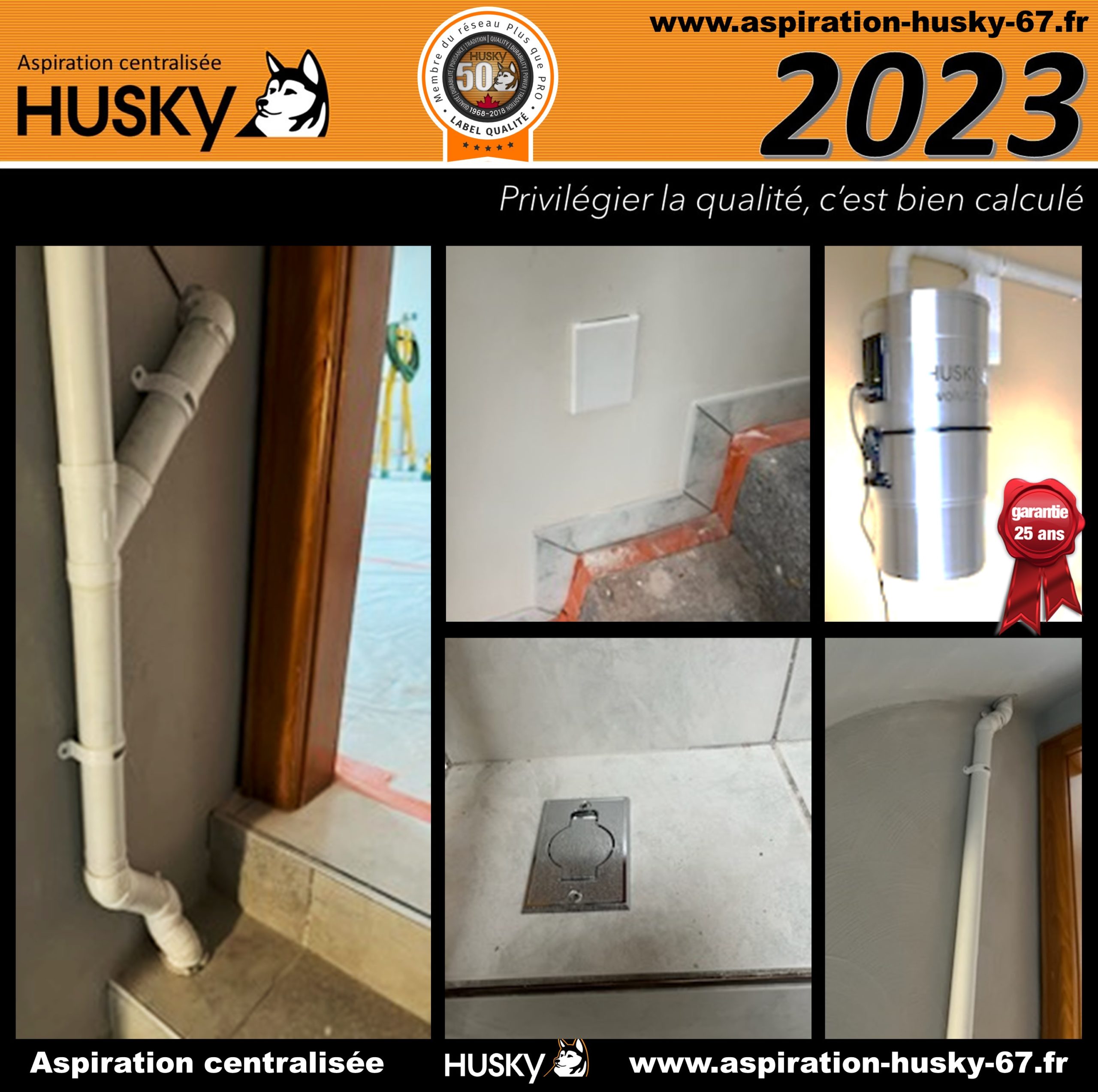 Une réalisation de la société BHK dans une maison existante de 150 M² située à Niederrœdern 67470 dans le département du Bas-Rhin en Alsace, région Grand Est. Installation d’un réseau PVC dans la cage d’escalier, il alimente 3 prises d’aspiration classiques. L’ensemble de ce réseau a été raccordé sur un modèle Husky ÉVOLUTION « édition limitée » de la marque Husky. Modèle hybride, équipé d’un filtre traité SILPURE et lavable en machine à laver, diode de contrôle, cuve de 34 litres, moteur By-pass avec démarrage et arrêt temporisé, puissance d’aspiration de 3977 mm de dépression, et couvert d’une garantie de 25 ans par le manufacturier des produits Husky.