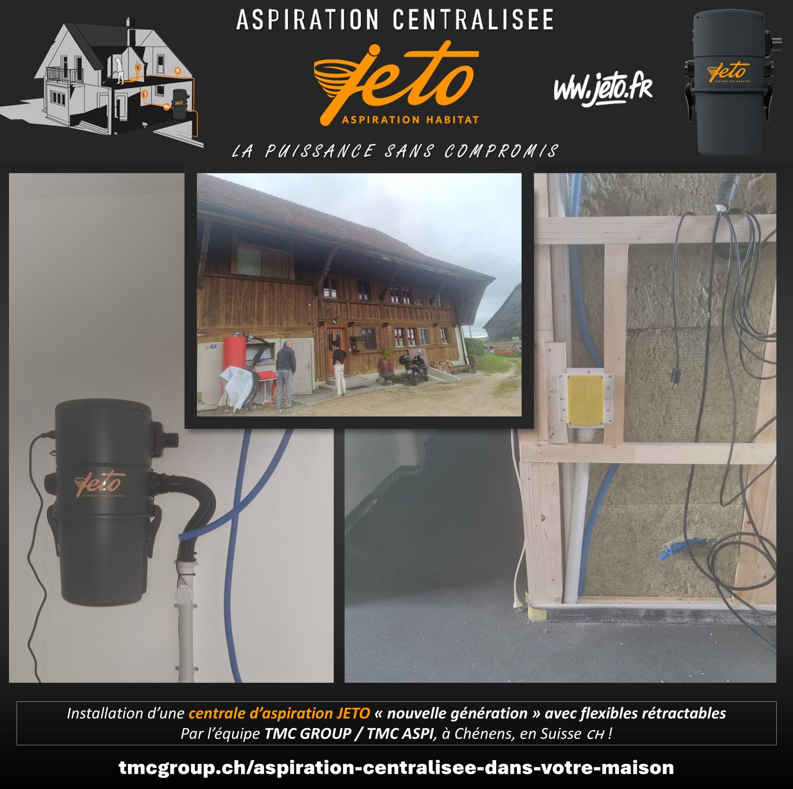 L’équipe TMC GROUP / TMC ASPI, distributeur exclusif de la marque JETO en Suisse, a réalisé l’installation d’un système d’aspiration centralisée JETO dans un corps de ferme en rénovation situé à Chénens, Suisse.