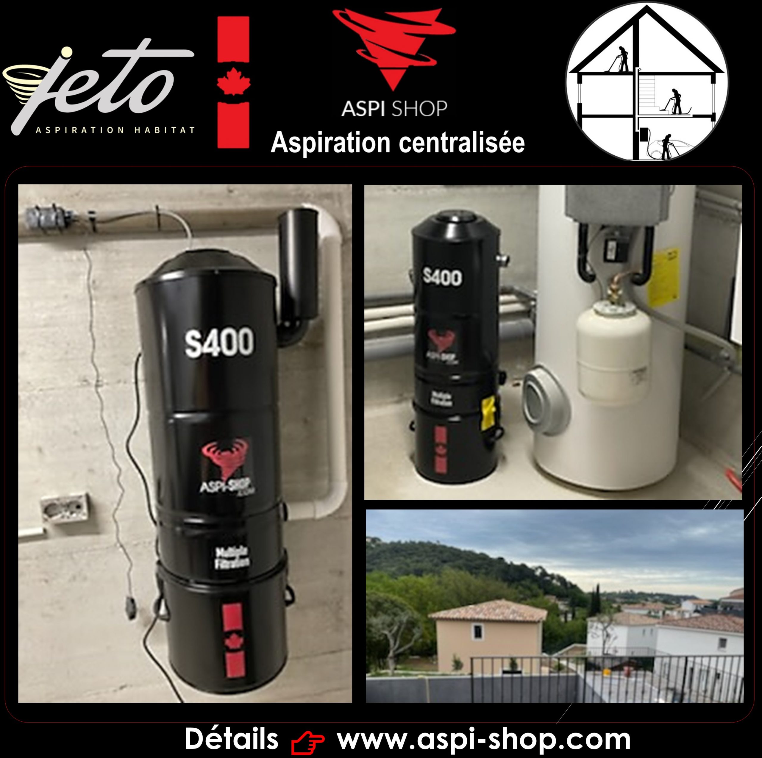 C’est un modèle ASPI SHOP S400 qui a été raccordé sur ce réseau, modèle hybride, équipé d’un filtre autonettoyant HEPA, d’une puissance d’aspiration de 4318 mm de dépression, 2 moteurs, couvert d’une garantie de 10 ans par le manufacturier canadien des produits ASPI SHOP !