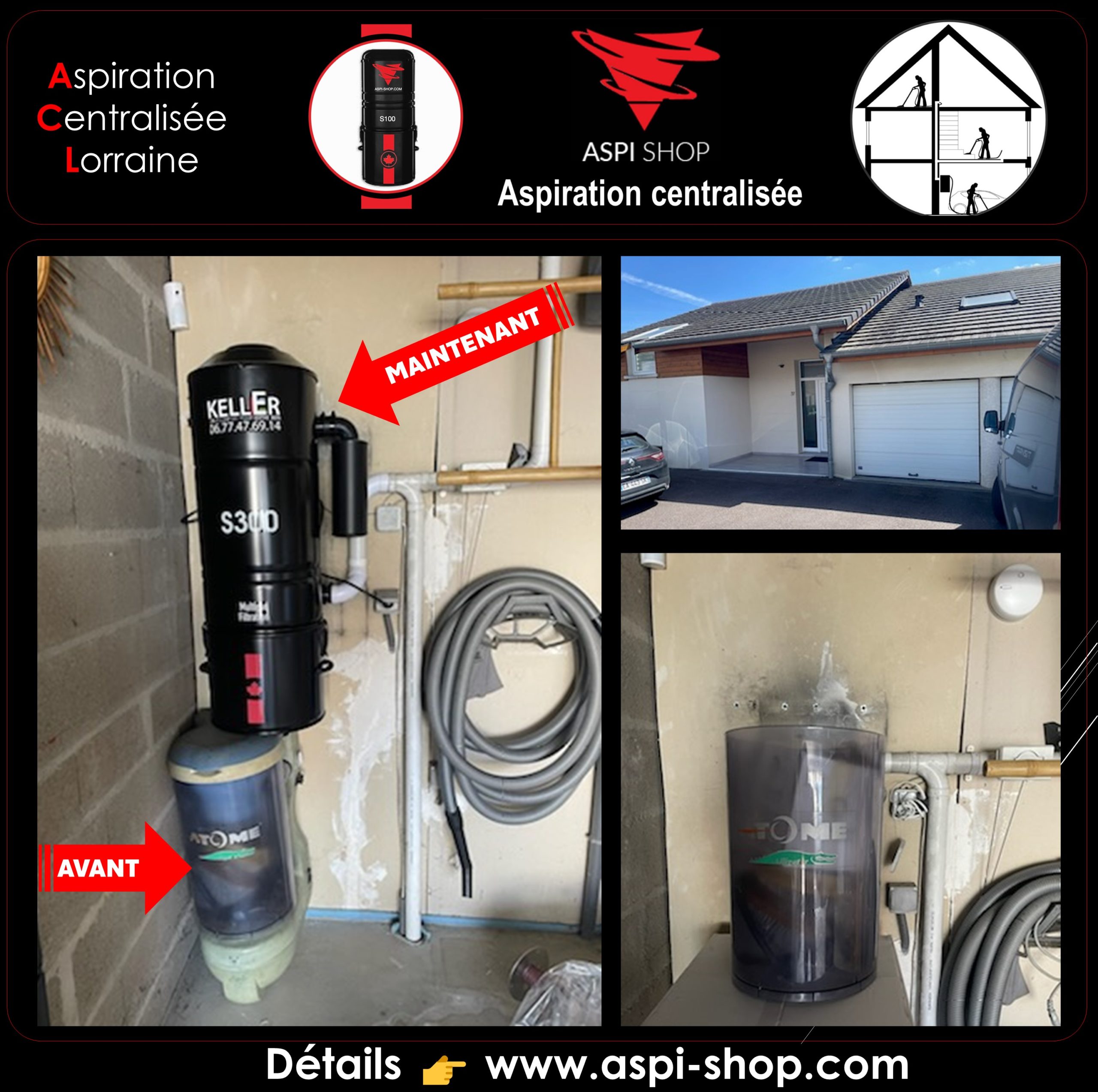 L’intervention de la société Aspiration Centralisée Lorraine a eu lieu dans une maison située à Lesménils, 54700, dans le département de la Meurthe-et-Moselle, région Grand Est. Cette maison, initialement équipée d’un système d’aspiration centralisée de marque ATOME, fonctionnait sur un réseau PVC alimentant plusieurs prises d’aspiration classiques. Les clients ont choisi de remplacer leur centrale d’aspiration par un modèle ASPI SHOP S300. Ce nouveau système hybride offre une puissance d’aspiration impressionnante de 3998 mm de dépression (39 KPA), 655 Air watts, est doté de deux entrées d’air, et intègre un filtre HEPA avec un système de décolmatage automatique pour une efficacité maximale.