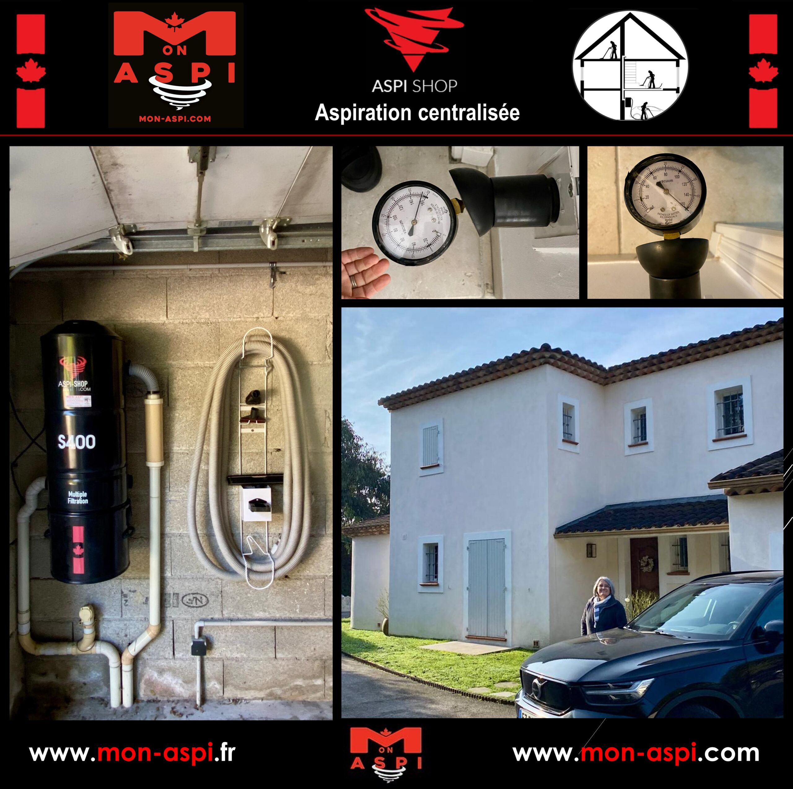Dans cette belle demeure située à Saint-Paul-de-Vence, un système d’aspiration centralisée ASPI SHOP S400 était déjà en place. Ce modèle hybride, équipé d’un filtre HEPA autonettoyant et offrant une puissance d’aspiration de 4318 mm de dépression, alimente plusieurs prises d’aspiration classiques via un réseau en PVC.