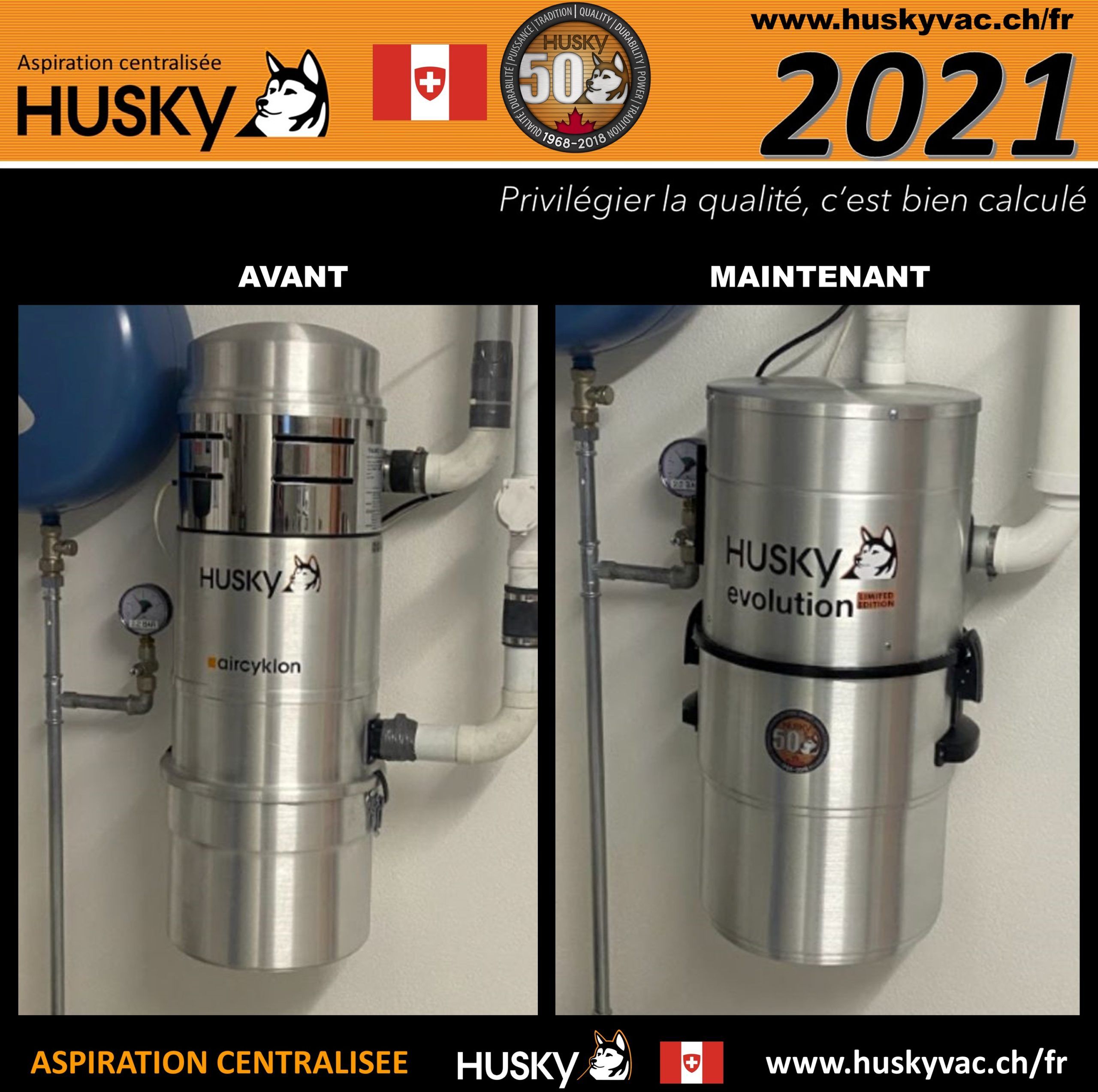 Intervention de la société Husky Suisse dans une villa existante située en Suisse et, équipée d’un ancien système d’aspiration centralisée avec la marque Husky sur un réseau PVC qui alimente plusieurs prises d’aspiration classiques. Les clients ont opté pour le remplacement de l’ancienne centrale d’aspiration avec un modèle Husky ÉVOLUTION, système hybride équipé d’un filtre lavable en machine à laver et traité SILPURE, cuve de 34 litres, diode de contrôle, moteur by-pass avec démarrage et arrêt temporisé, d’une puissance d’aspiration de 3977 mm de dépression, centrale d’aspiration couverte d’une de 25 ans par le manufacturier Canadien des produits Husky.