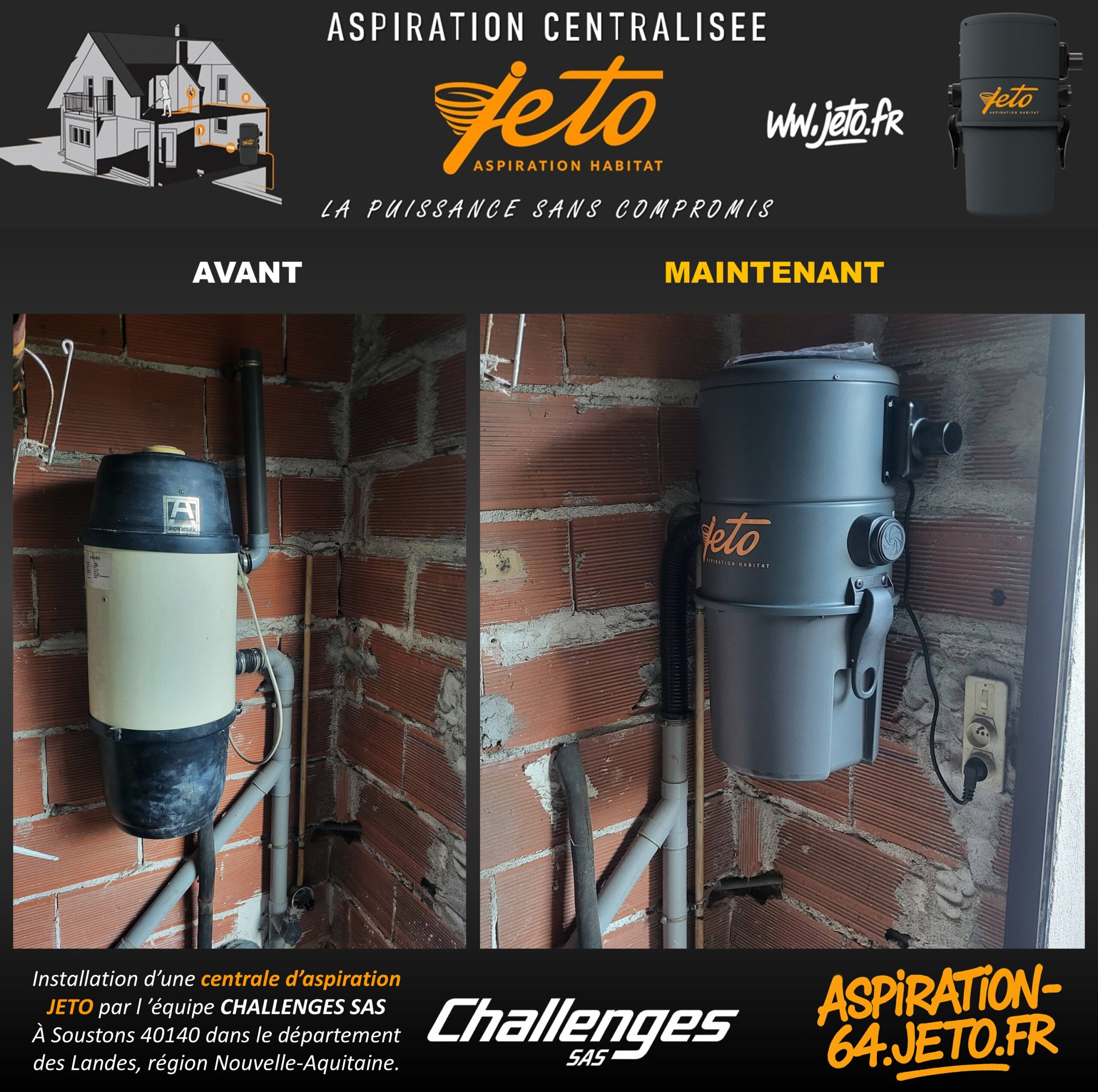 Après une analyse technique complète et un diagnostic de l’installation, les propriétaires ont choisi de remplacer leur centrale d’aspiration par une centrale JETO de dernière génération, entièrement compatible avec les réseaux existants, quelle que soit la marque d’origine.