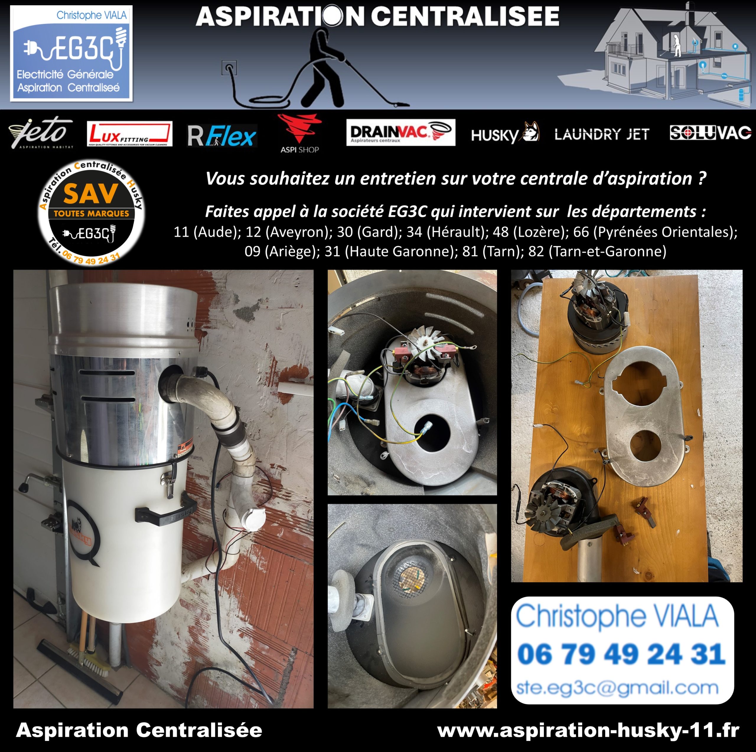 Intervention de la société EG3C dans une maison existante située à TRÈBES 11800 dans le département de l’Aude en région Occitanie. Cette maison est équipée depuis 13 ans d’un système d’aspiration centralisée Husky sur un réseau PVC qui alimente 7 prises d’aspiration classiques. Les clients ont souhaité un contrôle de la centrale d’aspiration, la société EG3C a procédé au contrôle des moteurs et le remplacement des 4 charbons, le remplacement du filtre lavable et un contrôle du réseau et des prises d’aspiration.